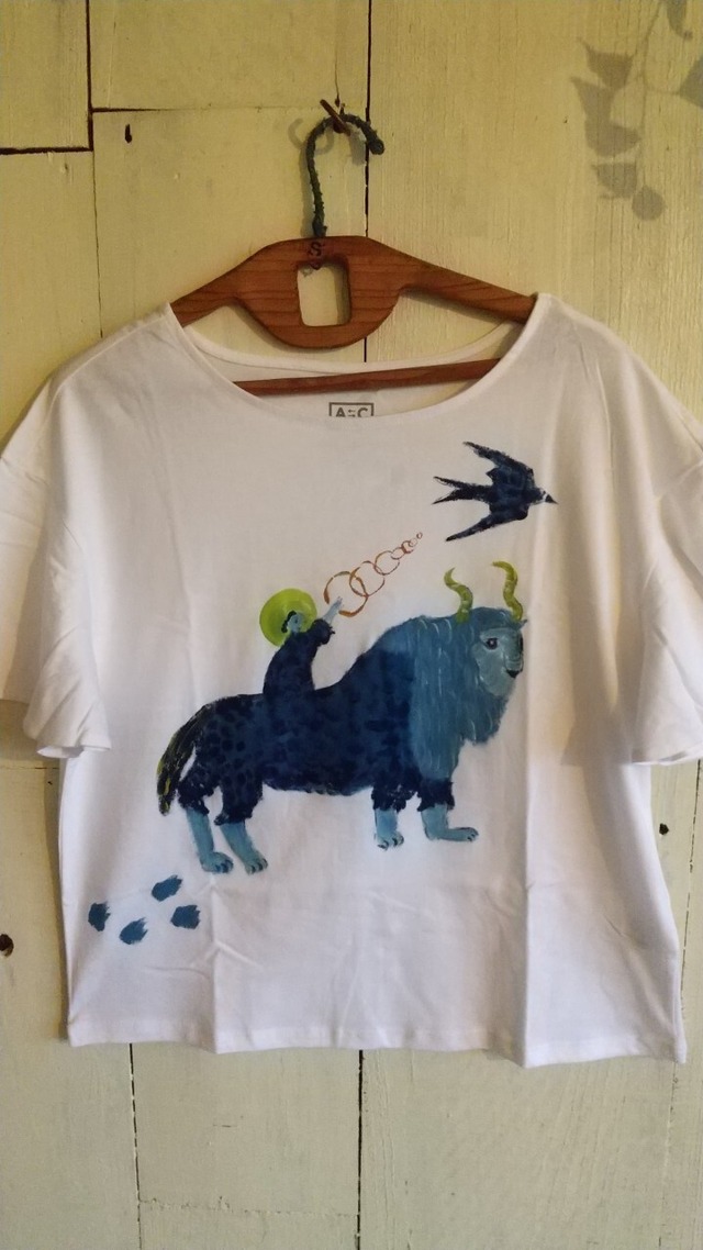 イソップ童話のひとコマのような。 レディースLL(身長160~173 胸囲86~92) ネイビー 綿100% フレアスリーブ シルクスクリーン用インクで手描きし、熱を加えて定着させています。 お洗濯の際は、裏返したままネットなどに入れて洗濯機のご使用をおすすめします。 手洗いでこすらないよう、またタンブラー乾燥機も縮みやインク落ちの原因になることがありますのでご注意ください。